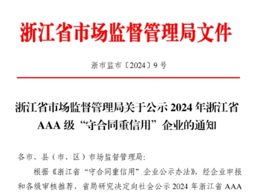 喜報丨晴天科技獲評2024年浙江省 AAA 級“守合同重信用”企業